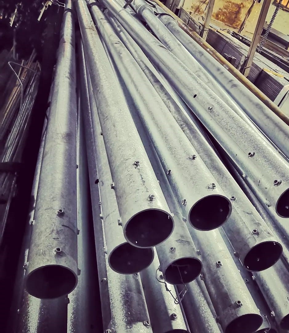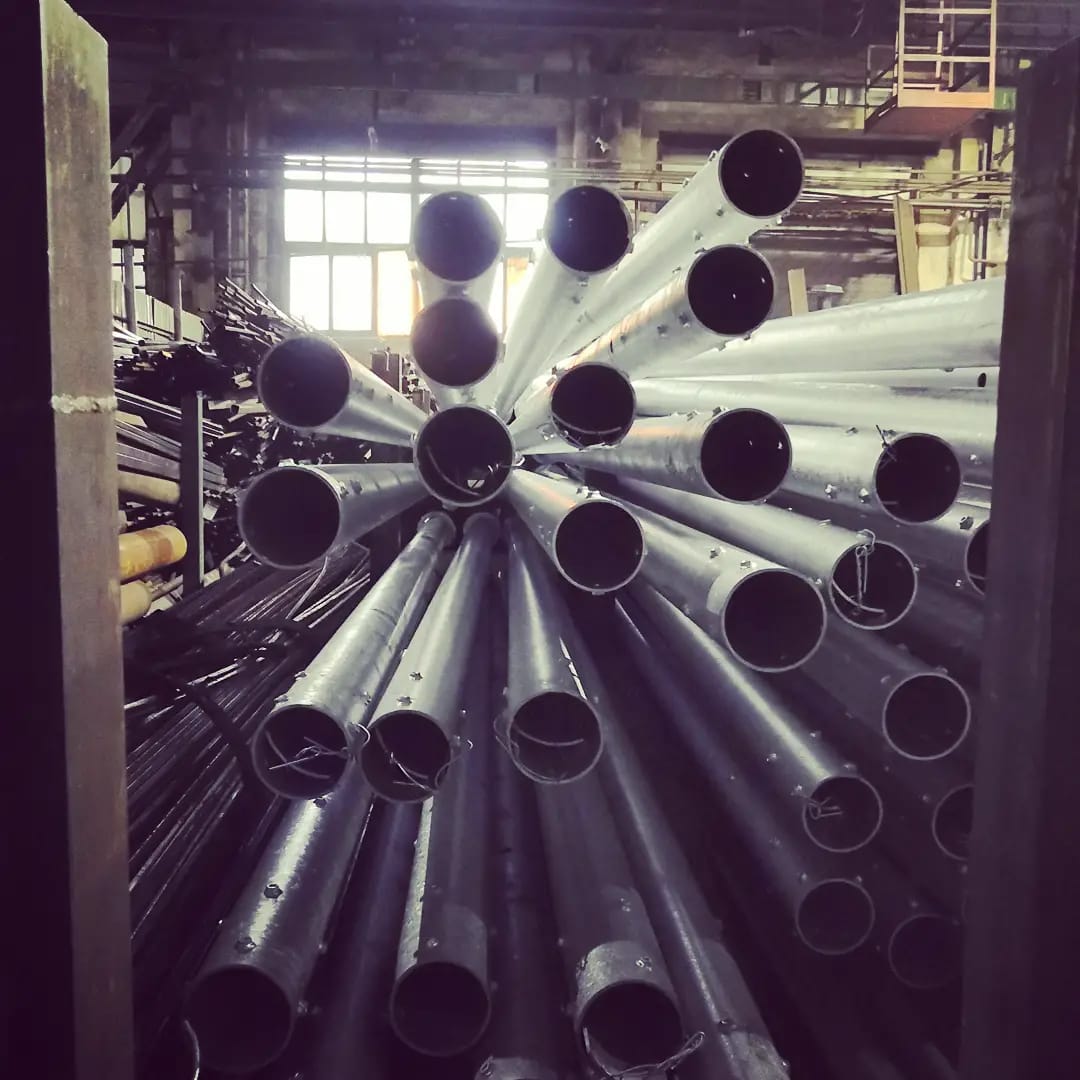 Трубчатые опоры. Круглые в сечении конструкции также выпускаются с фланцевым креплением и для прямой установки в грунт, в силовом и не силовом исполнении. В зависимости от требуемой высоты, изготавливаются одно- или многосекционные стволы. Универсальный внешний вид опор также приемлем для подавляющего большинства объектов.